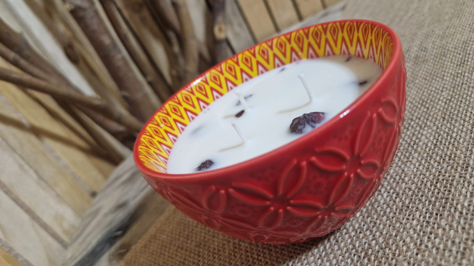 Indulge in the warm, inviting aroma of our Cherry Almond Candle, hand-poured with creamy soy wax into a vibrant red ceramic bowl adorned with intricate floral patterns and a sunny yellow zigzag rim. Infused with the sweet-tart essence of ripe cherries and nutty almond, it's topped with genuine dried sour cherries for a rustic touch. Featuring three cotton wicks for an even burn, this artisanal candle evokes cozy evenings and homemade treats, perfect for adding a fruity glow to any space.