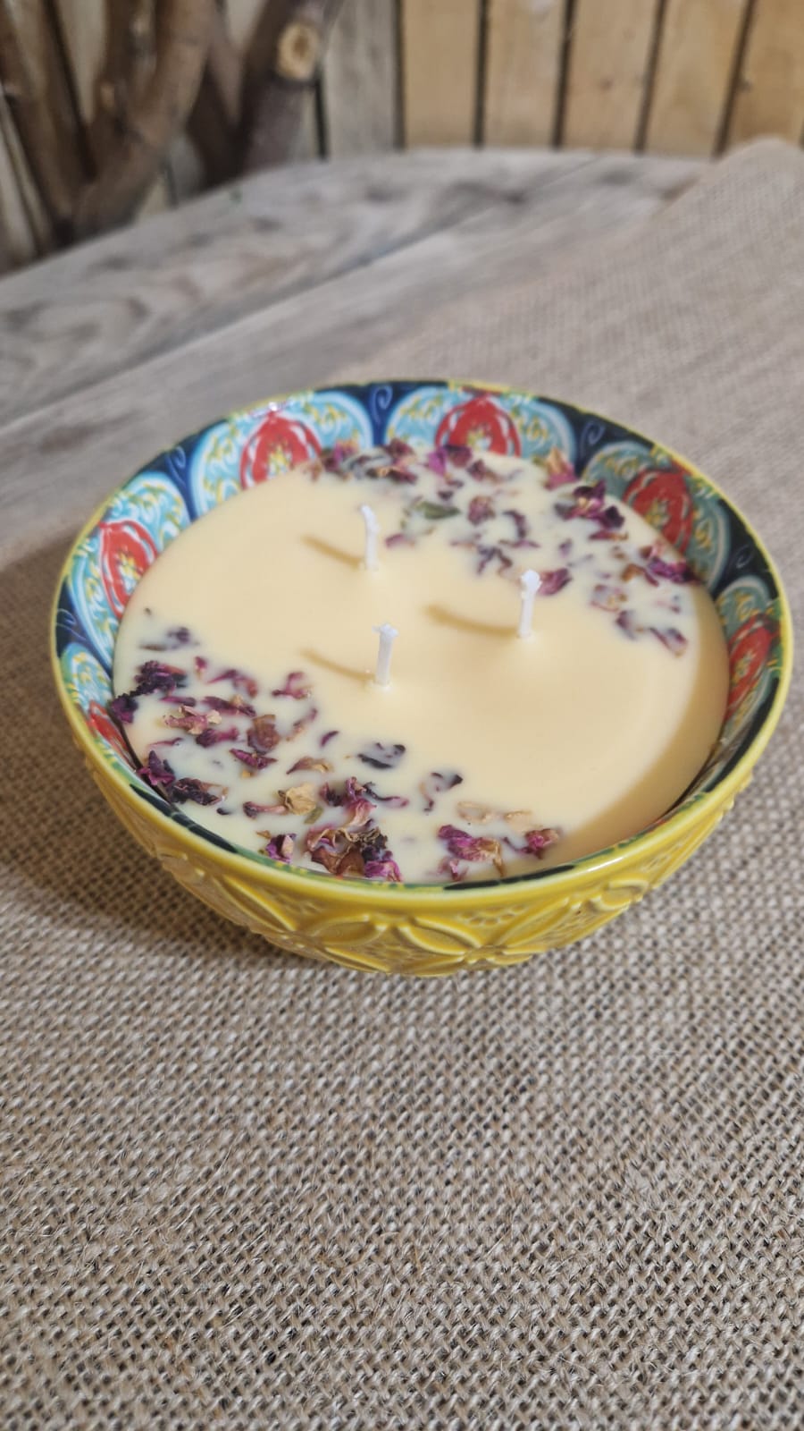 This handcrafted rose and vanilla candle nestles in a vibrant, bohemian-style ceramic bowl with intricate multicolored patterns along the rim and a textured yellow base. Its creamy beige wax is generously adorned with dried rose petals in shades of pink and red, while dual wicks ensure a steady, even burn. Light it to fill your space with the soothing, romantic blend of floral rose and sweet vanilla notes, ideal for cozy relaxation or as a thoughtful gift.